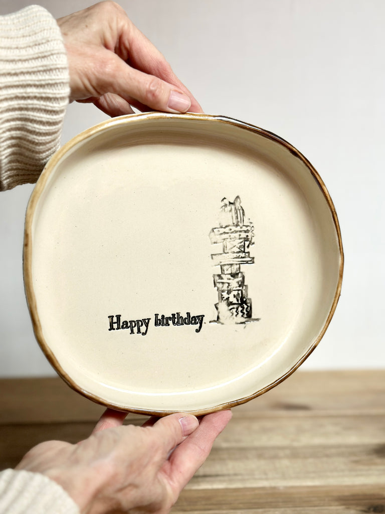 A handcrafted ceramic plate that blends modern design simplicity with timeless character. The design features a hand-stamped stack of presents and the words Happy birthday, glazed in black for a soft, vintage look.
