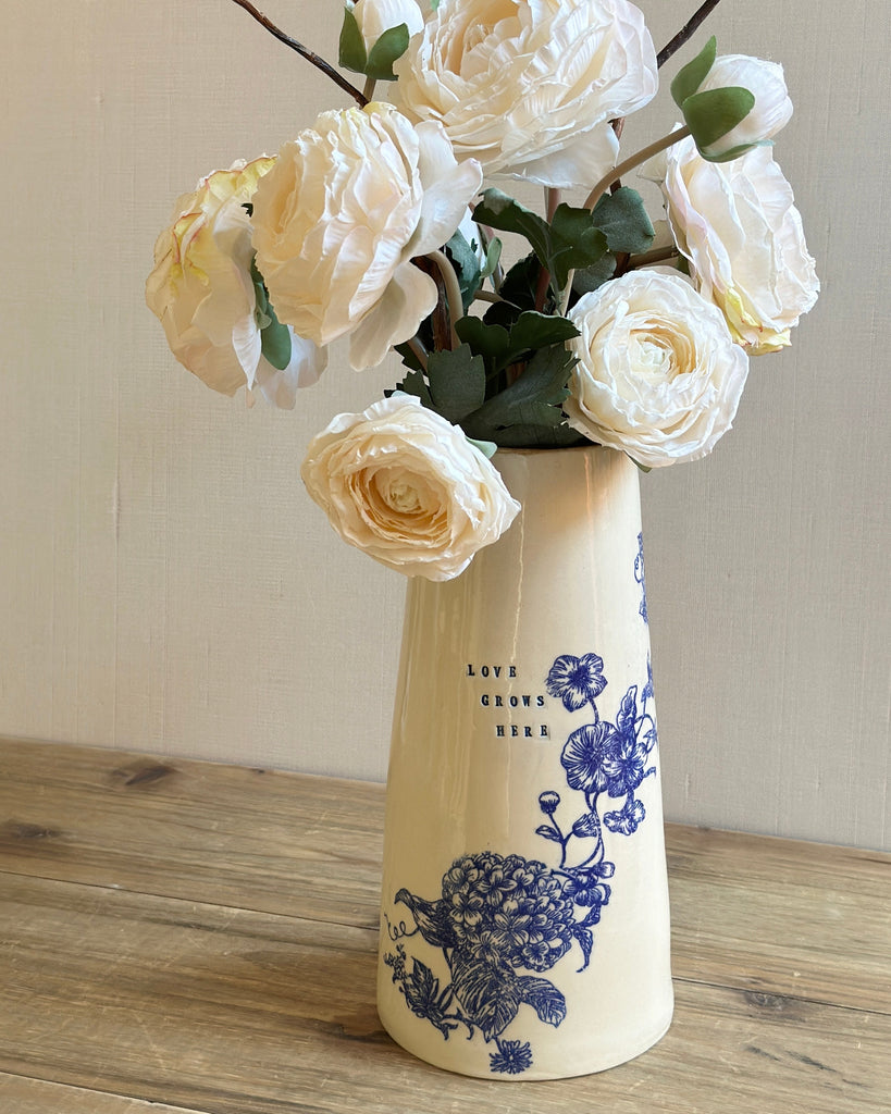A timeless vase that celebrates where love takes root and memories bloom. Hand-built from stoneware and finished with vintage-style blue floral transfers, each piece can be personalized to mark life’s most meaningful moments.
