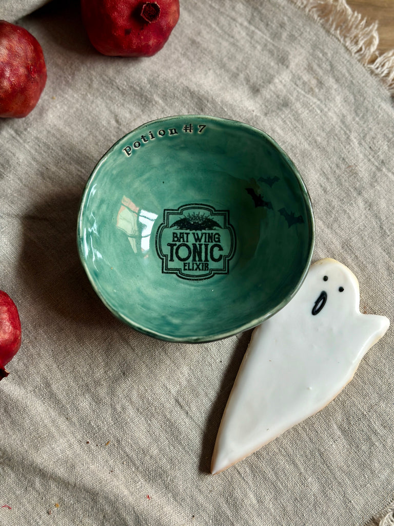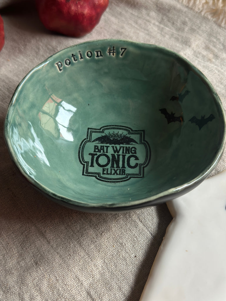 Each apothecary bowl is one of a kind and features a unique potion label applied by hand. Some bowls also include a stamped Potion # on the interior rim. Please select your preferred glaze color, label, and style from the options below — you will receive the exact bowl shown in the photo for that variant
