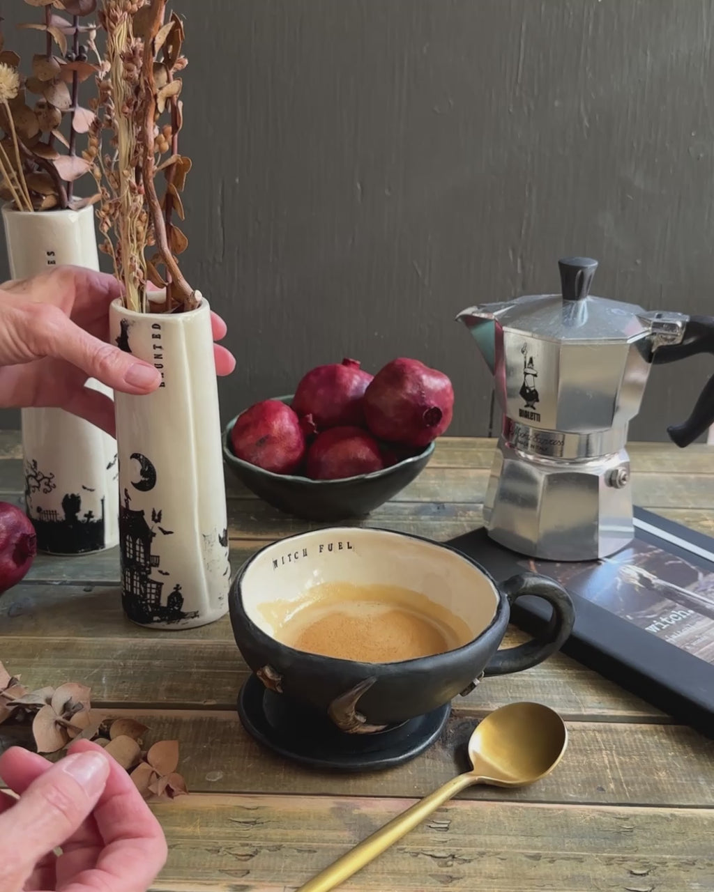 Hand-built from stoneware and finished in soft ivory with a rustic red interior, each vase features a vintage-style haunted scene — moonlit graveyards, flitting bats, and shadowed houses.