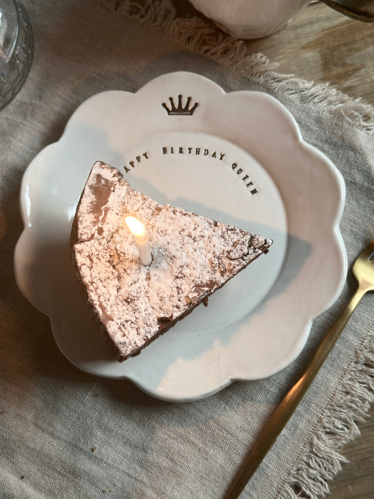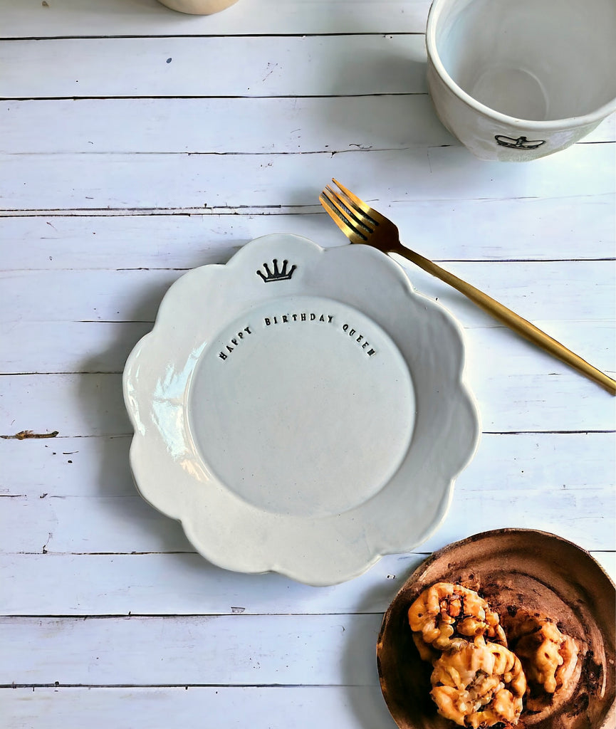 This handcrafted scalloped plate features a stamped crown and the words HAPPY BIRTHDAY QUEEN — a keepsake that makes birthdays feel a little more special. The design is finished in a creamy white glaze framed by a deep blue textured rim that catches light beautifully.