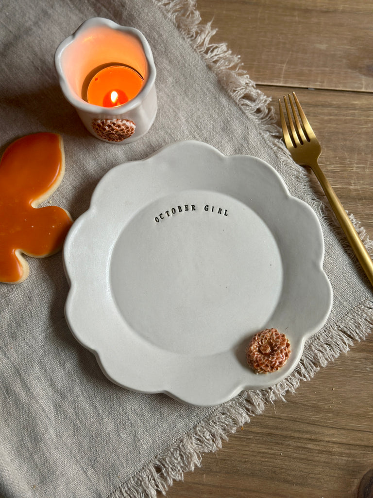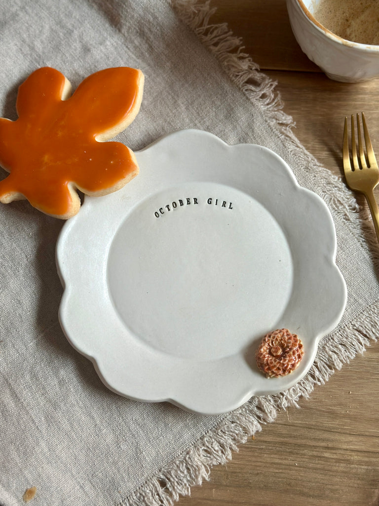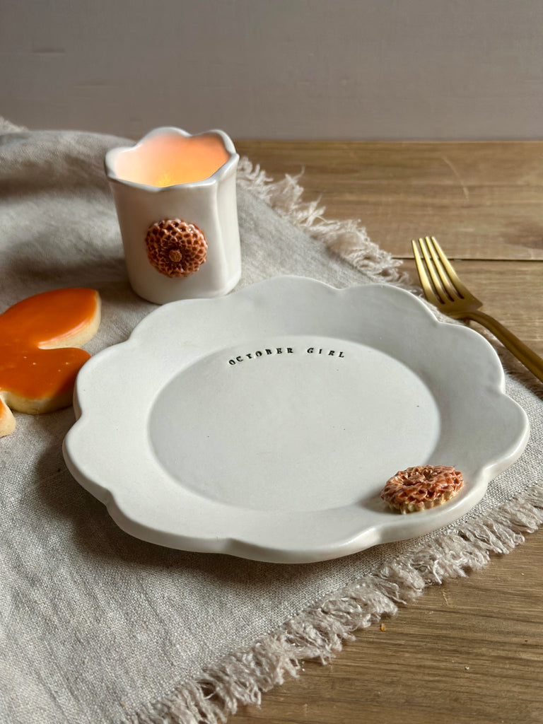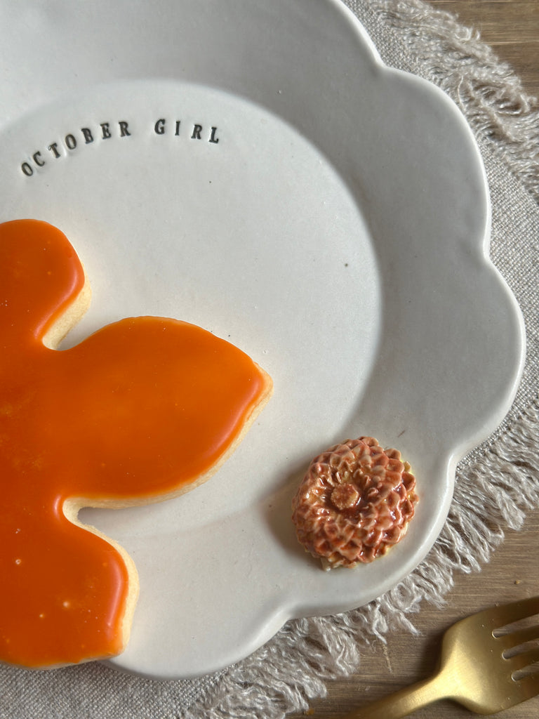 Celebrate October’s bloom with this handcrafted Marigold Girl Plate, adorned with a sculpted rustic orange marigold. Handcrafted from white stoneware clay and glazed in a soft satin cream glaze. The words "October Girl" are stamped and glazed in black.