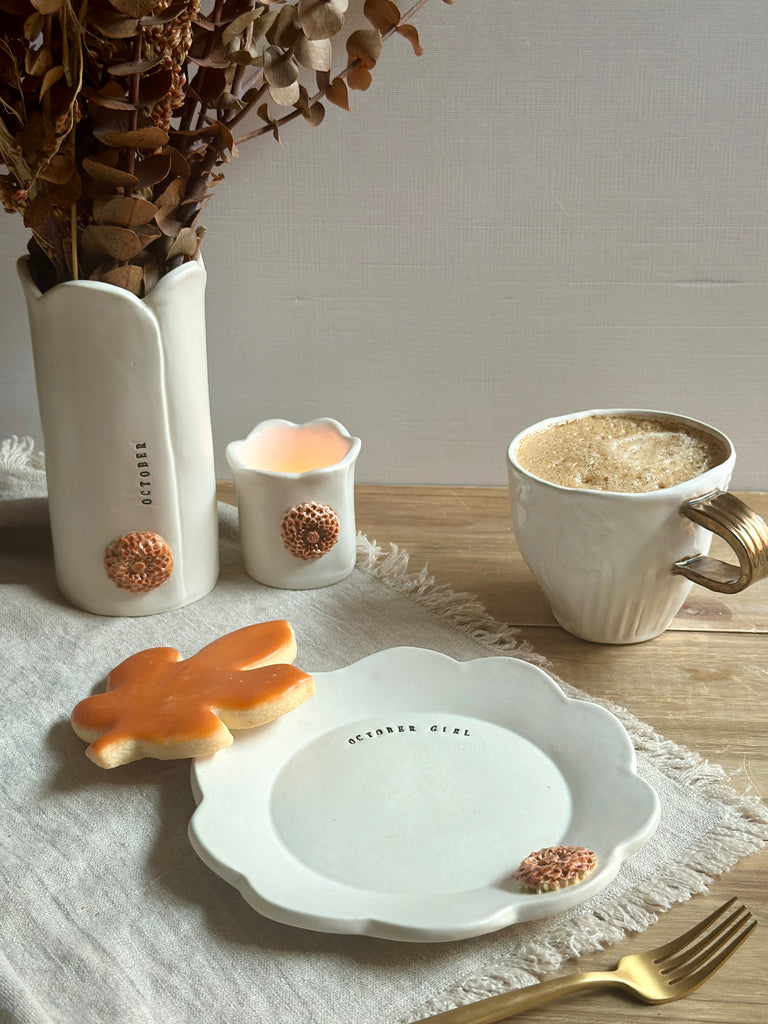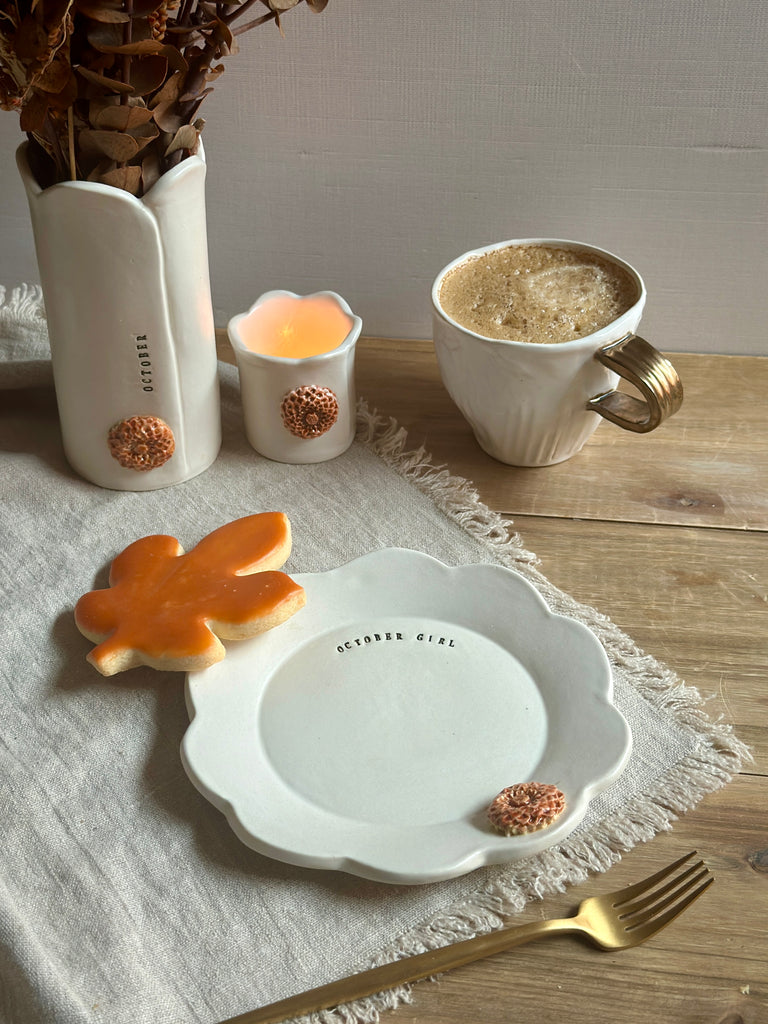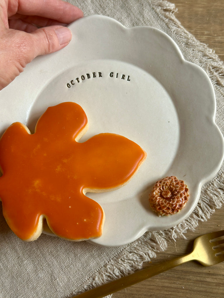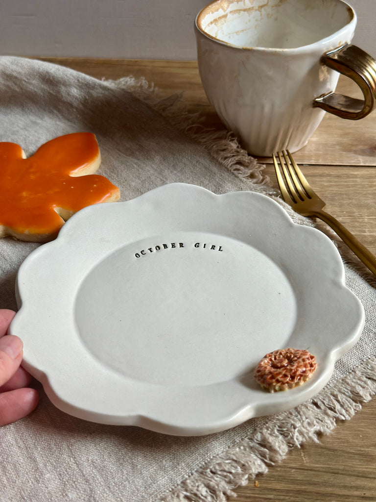 Celebrate October’s bloom with this handcrafted Marigold Girl Plate, adorned with a sculpted rustic orange marigold. Handcrafted from white stoneware clay and glazed in a soft satin cream glaze. The words "October Girl" are stamped and glazed in black.