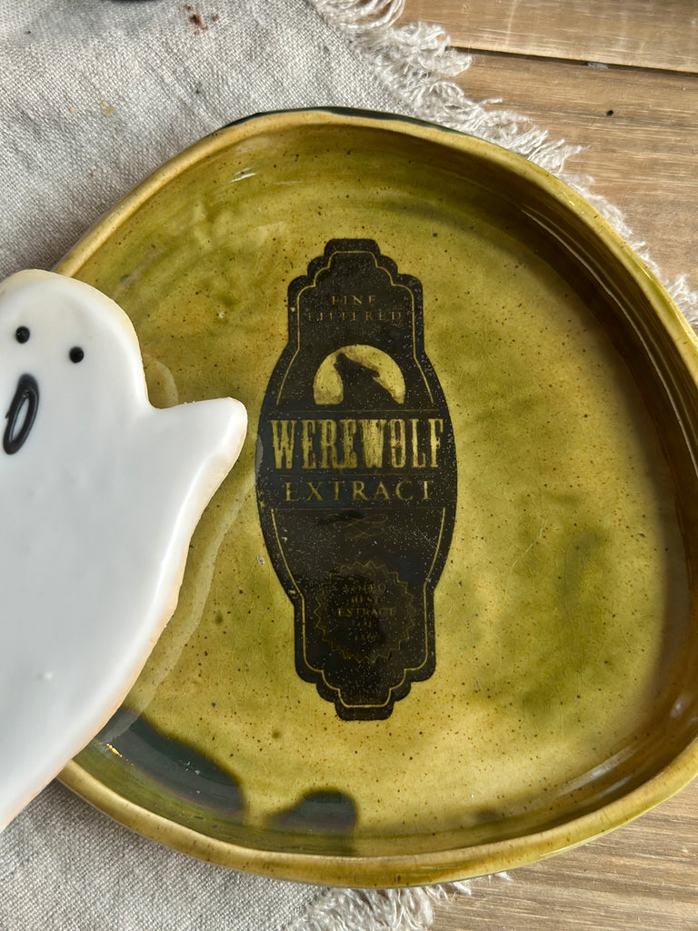 A hauntingly beautiful handmade plate featuring a vintage-style Werewolf Extract poison label.  Perfect for Halloween tablescapes or as a collectible piece of artful décor.