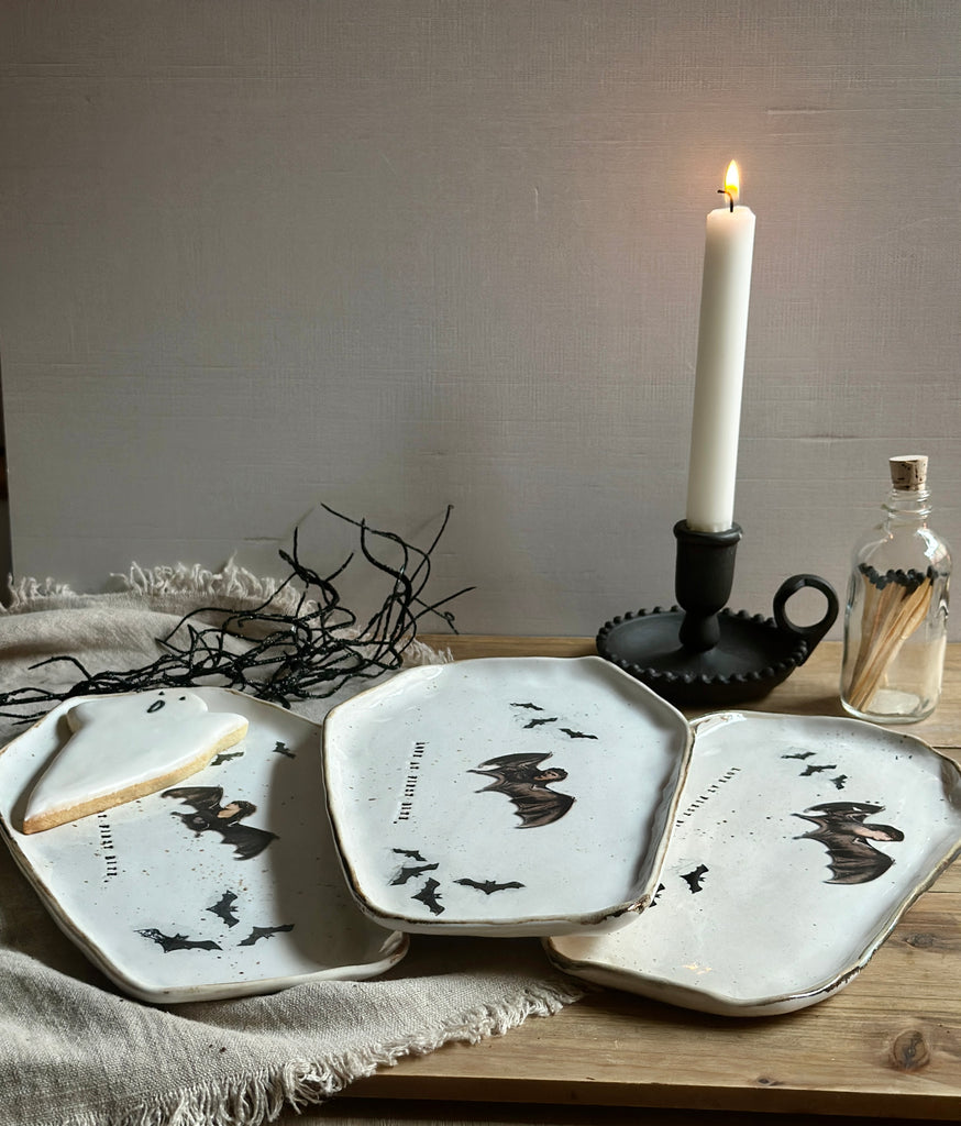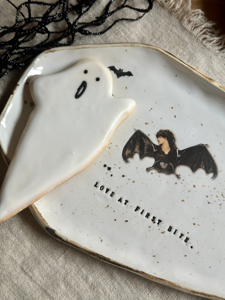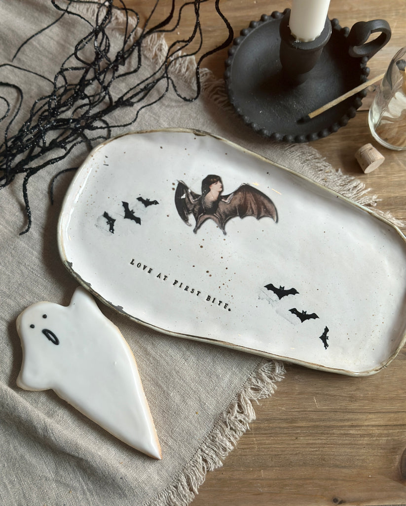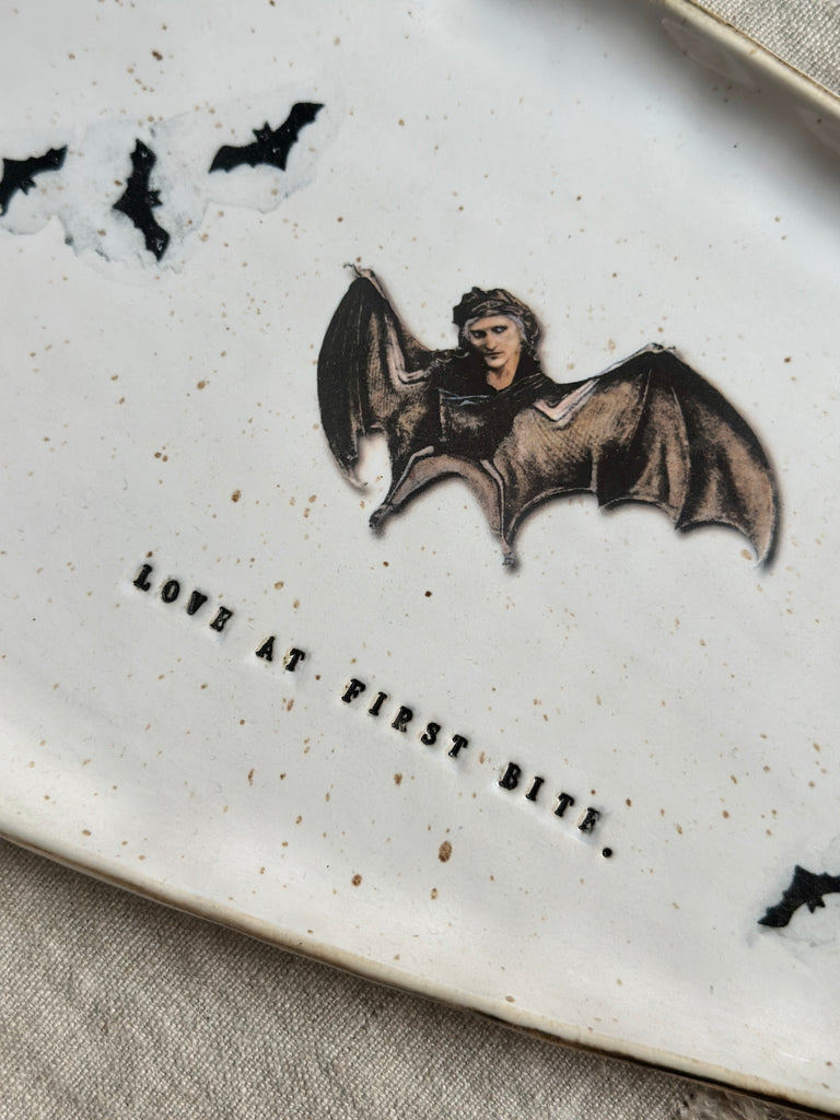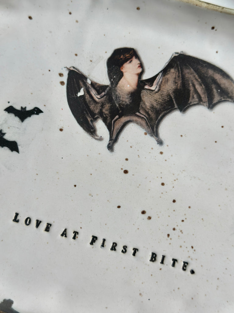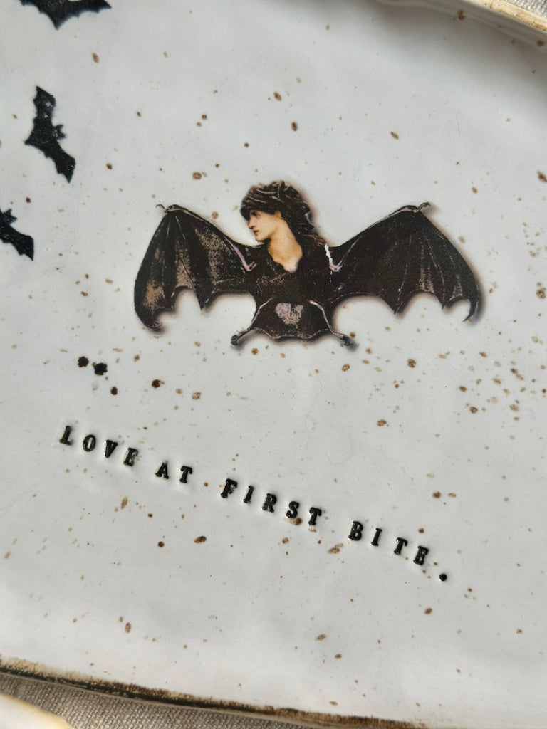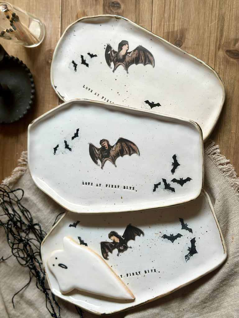 A hauntingly beautiful handmade plate for Halloween lovers and collectors alike. Shaped like a coffin and stamped with LOVE AT FIRST BITE, each piece features flying bats and a mysterious bat woman — no two are ever the same.