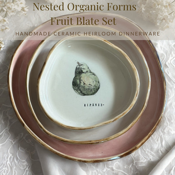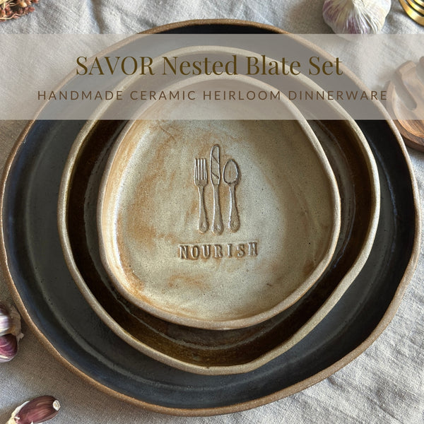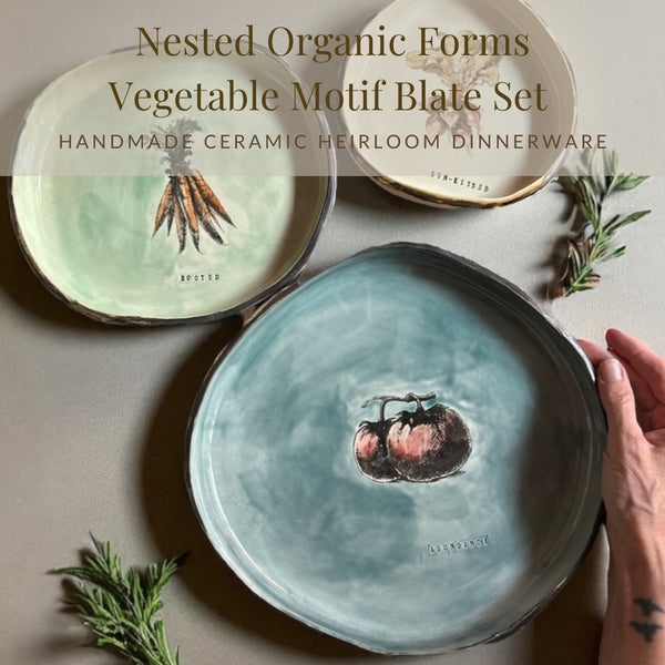 Handcrafted with softly curved, organic shapes, these nested plates are designed as both functional dinnerware and timeless art. Each set layers beautifully, inviting you to mix, match, and create a story at your table.