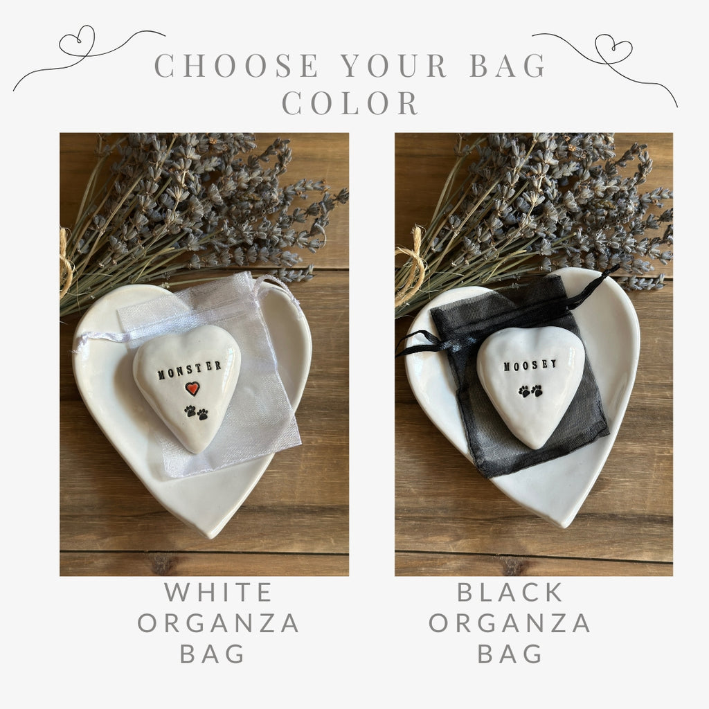 - In the PERSONALIZATION BOX, add: 1. Your Pet's name, 2. whether you would like a red or black heart added, 3. whether you would like paw prints added, 4. organza bag color preference-- black or white.