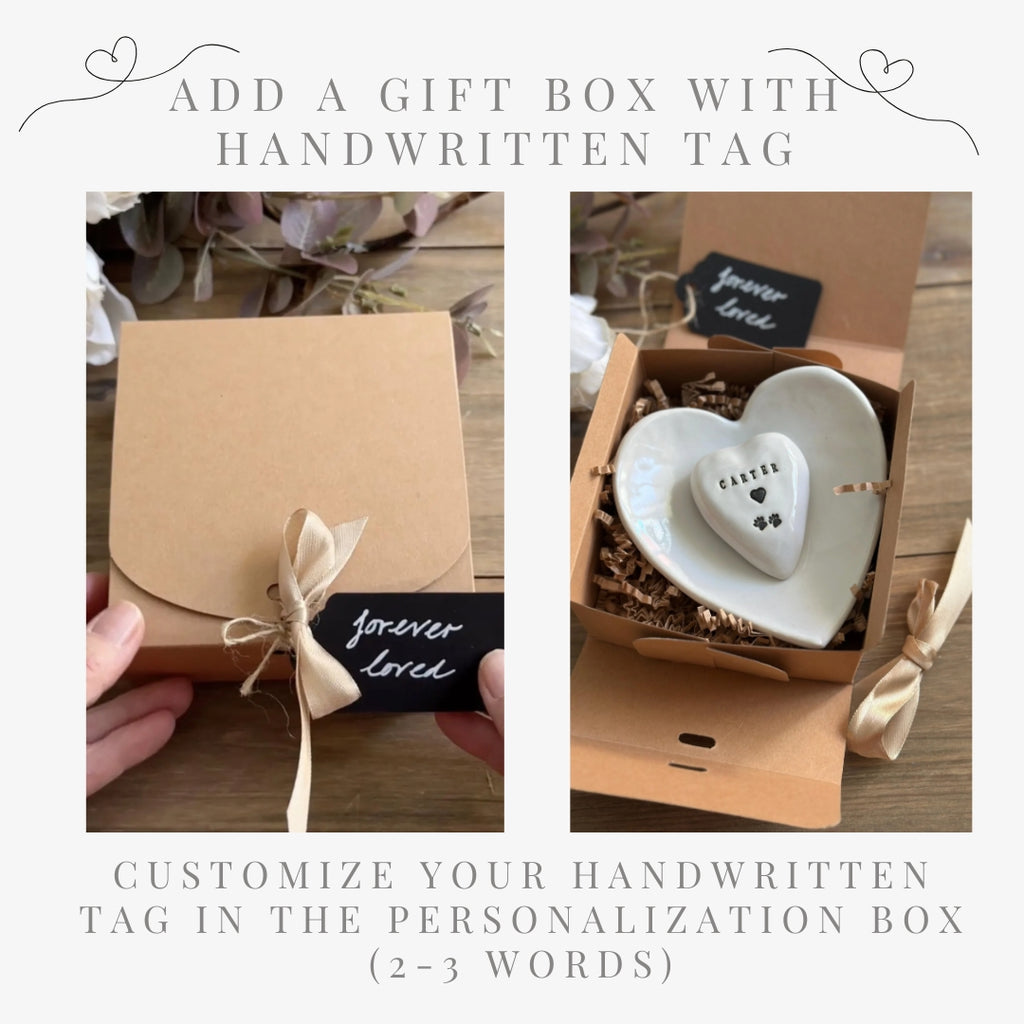 Includes personalization with your pet’s name, paw prints, and a heart accent in red or black. Each gift box also comes with a handwritten tag — you can choose a short 2–3 word message.