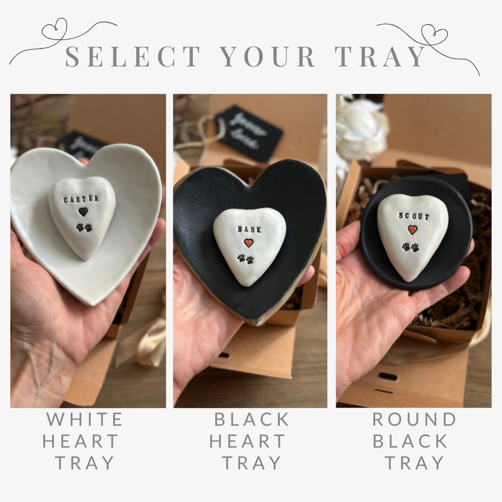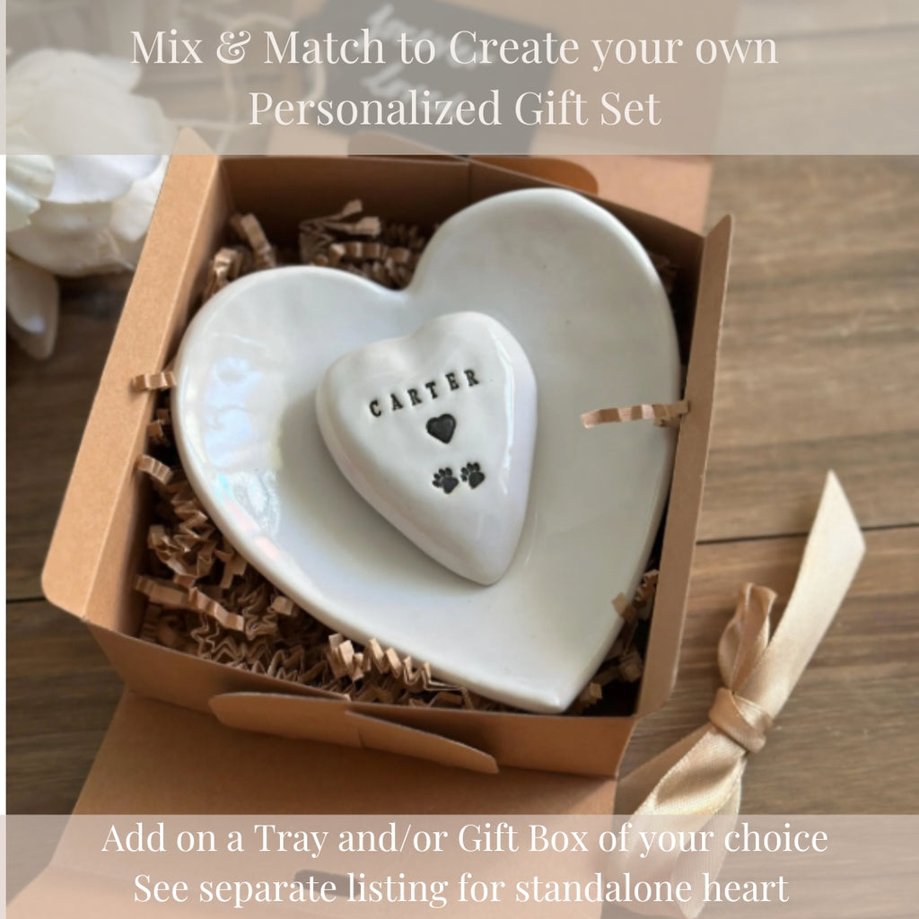 This personalized ceramic heart and tray gift box serves as a cherished pet memorial and sympathy gift, keeping your beloved companion’s memory close. Each piece is handcrafted with care, stamped with your pet’s name and paw prints, and glazed to create a timeless remembrance you can display or give as a heartfelt gift.