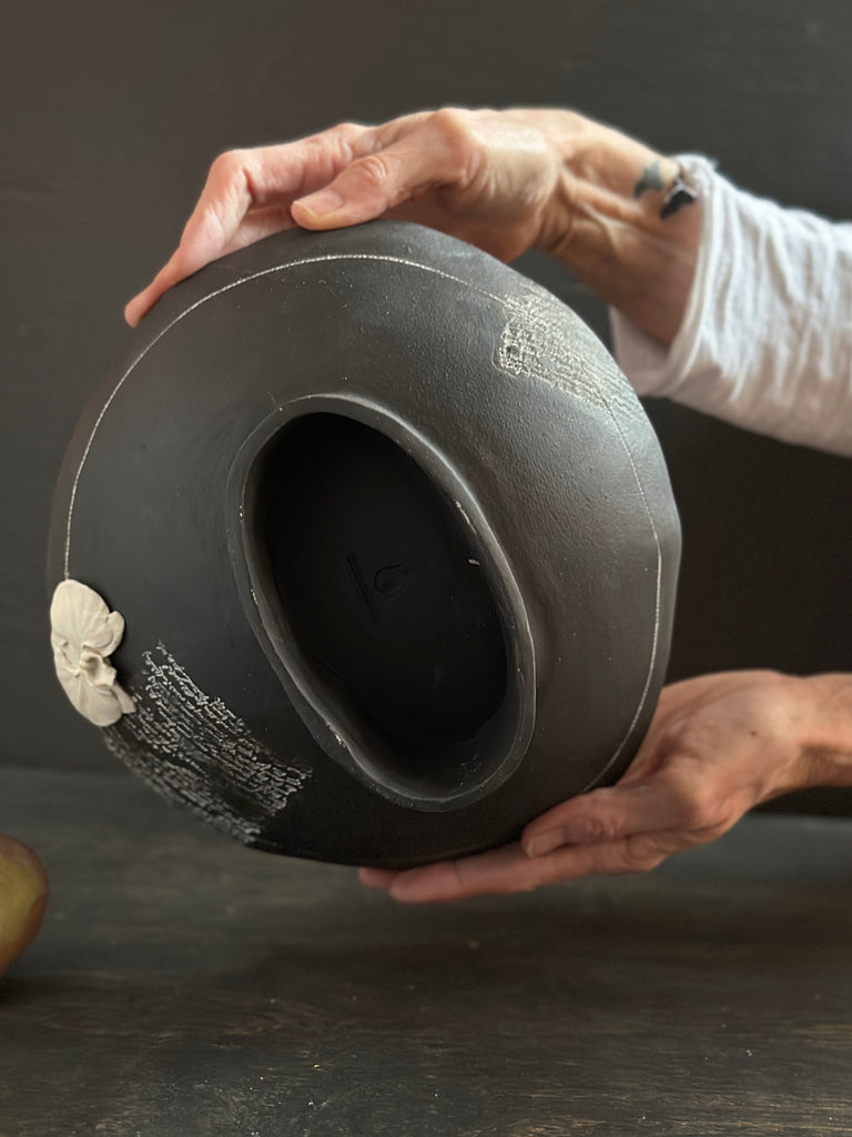 • Handbuilt from rich black clay and a sculpted porcelain orchid