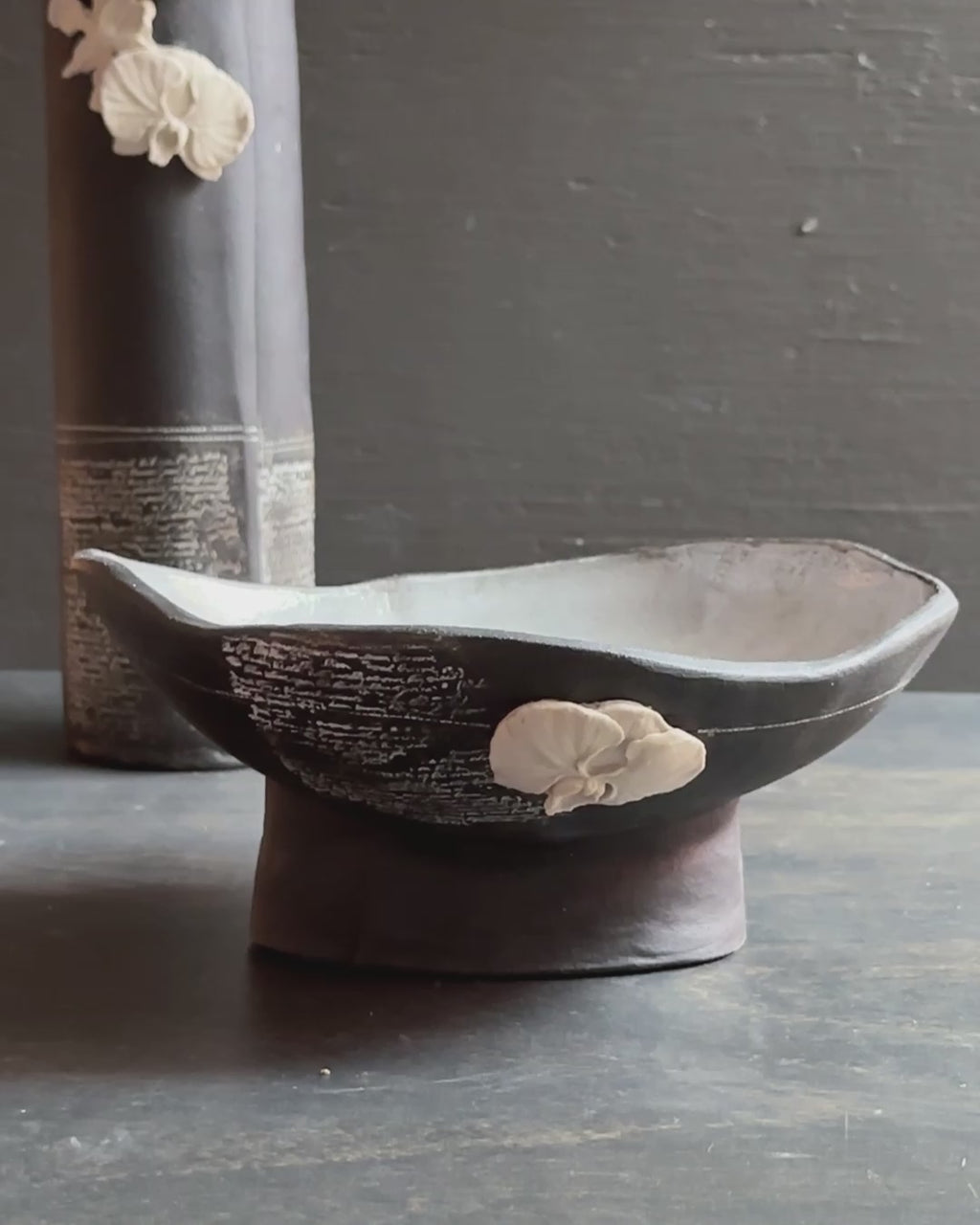 A sculptural pedestal bowl in dark clay, finished with a hand-formed porcelain orchid — designed as a functional art object for the table or home.