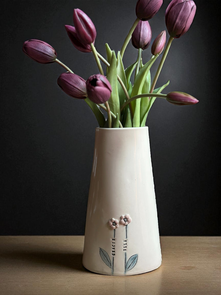 Celebrate family with the Family Garden Heritage Vase, a heartfelt, handmade piece featuring delicate daisies with hand-stamped stems, each bearing the name of a loved one. Perfect for grandparents, parents, or anyone who cherishes family, this one-of-a-kind vase beautifully symbolizes love and connection.