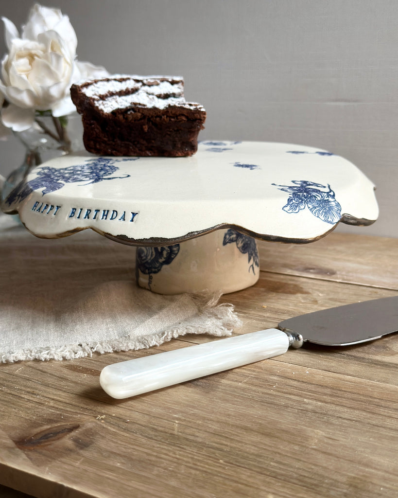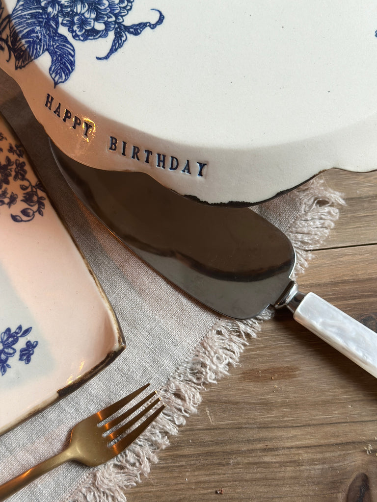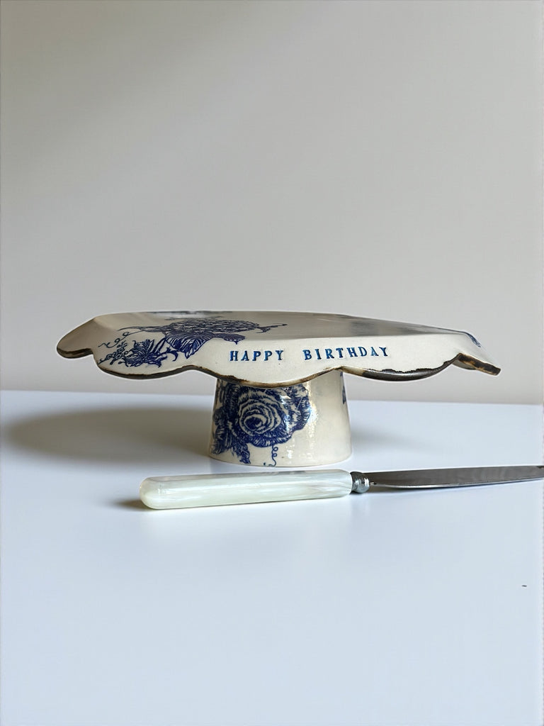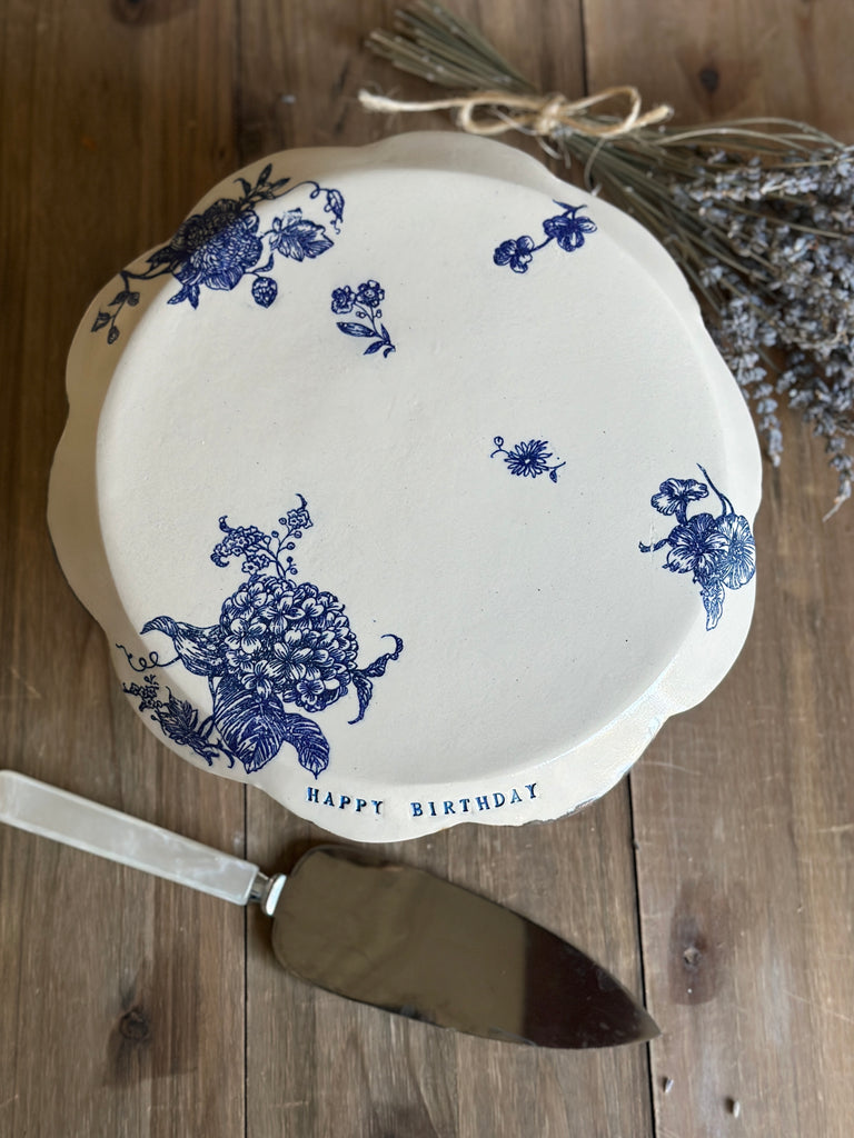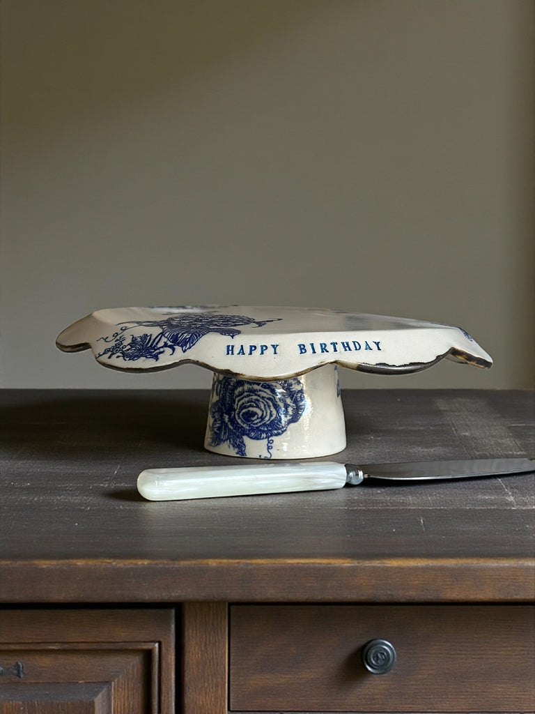 This one-of-a-kind handcrafted cake stand celebrates special moments with timeless charm. Hand-built from creamy white stoneware and finished with vintage-inspired cobalt floral transfers, it features a softly ruffled edge and stamped “HAPPY BIRTHDAY” lettering along the rim, glazed in blue. Finished with a sheer glaze and a vintage gold rim.