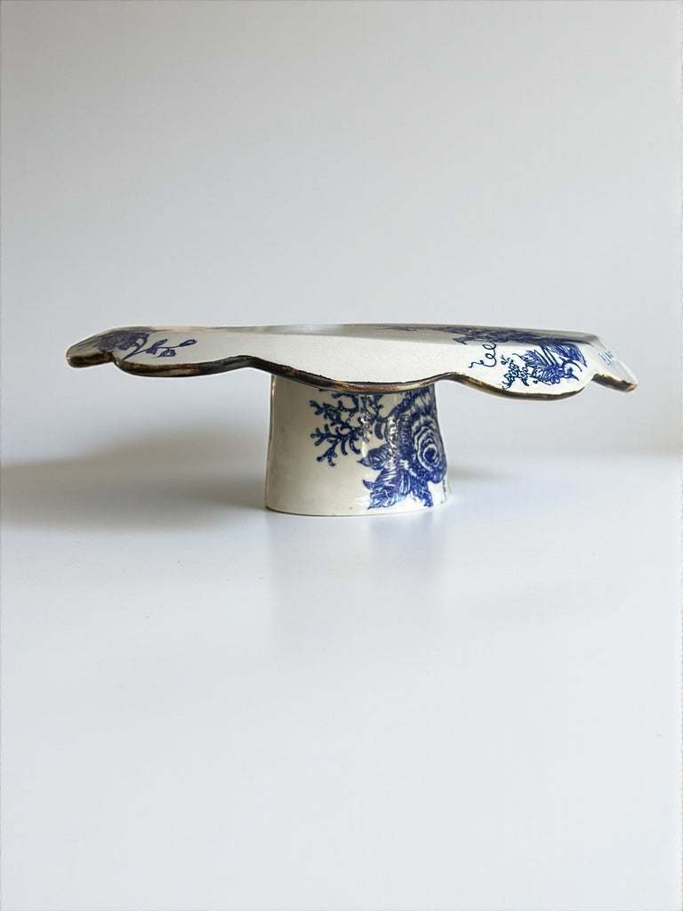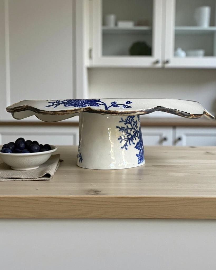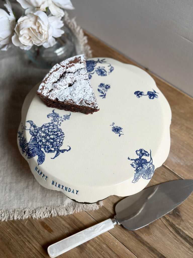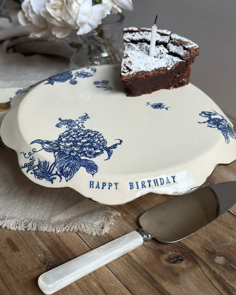 This one-of-a-kind handcrafted cake stand celebrates special moments with timeless charm. Hand-built from creamy white stoneware and finished with vintage-inspired cobalt floral transfers, it features a softly ruffled edge and stamped “HAPPY BIRTHDAY” lettering along the rim, glazed in blue. Finished with a sheer glaze and a vintage gold rim.