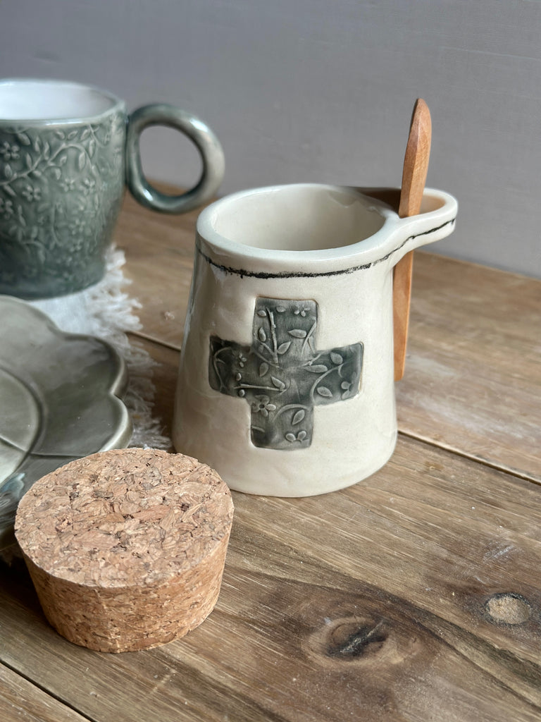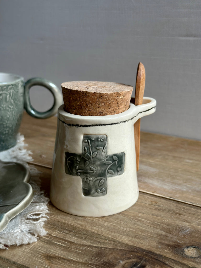 This charming handmade sugar cellar features a gray textured flower pattern swiss cross and is finished with a sheer glaze and hand-drawn line.  It comes with a snug cork top and a wooden spoon that conveniently hangs from the side.