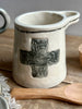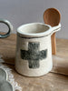 This charming handmade sugar cellar features a gray textured flower pattern swiss cross and is finished with a sheer glaze and hand-drawn line. It comes with a snug cork top and a wooden spoon that conveniently hangs from the side.