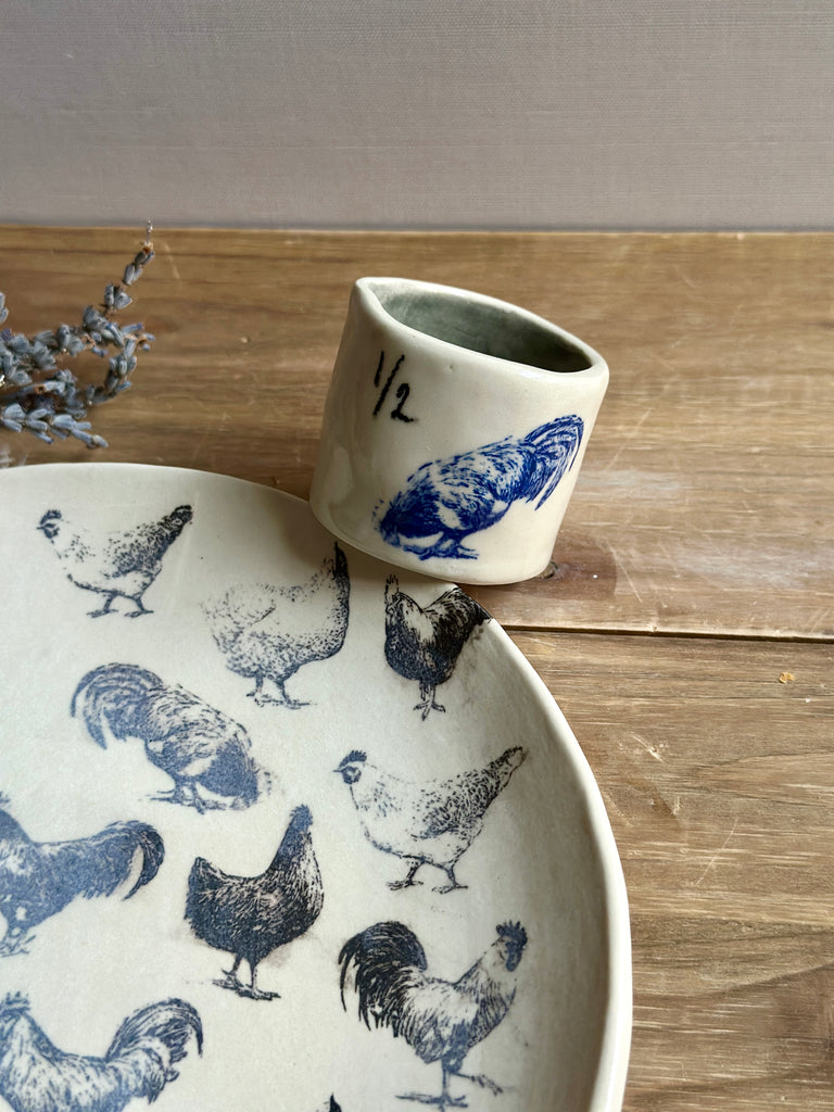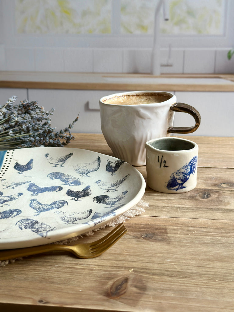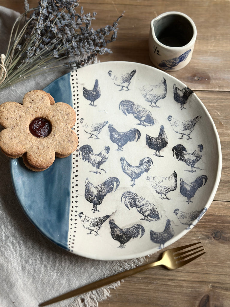 A handcrafted ceramic plate celebrating the humble beauty of farmhouse mornings. Vintage-style hens are silkscreened onto stoneware and contrasted with a band of soft indigo glaze — a subtle nod to classic blue pottery, reimagined for modern life.