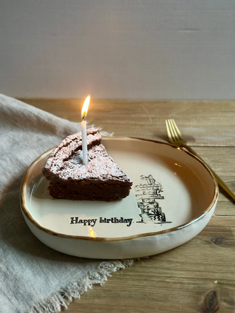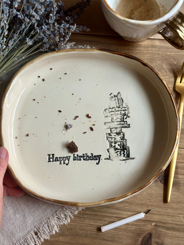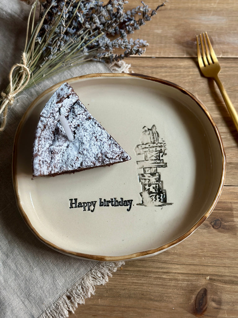 A handcrafted ceramic plate that blends modern design simplicity with timeless character. The design features a hand-stamped stack of presents and the words Happy birthday, glazed in black for a soft, vintage look.