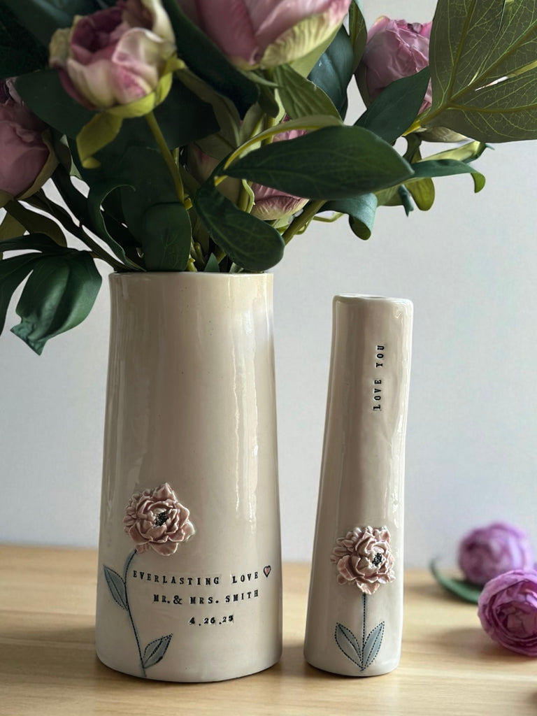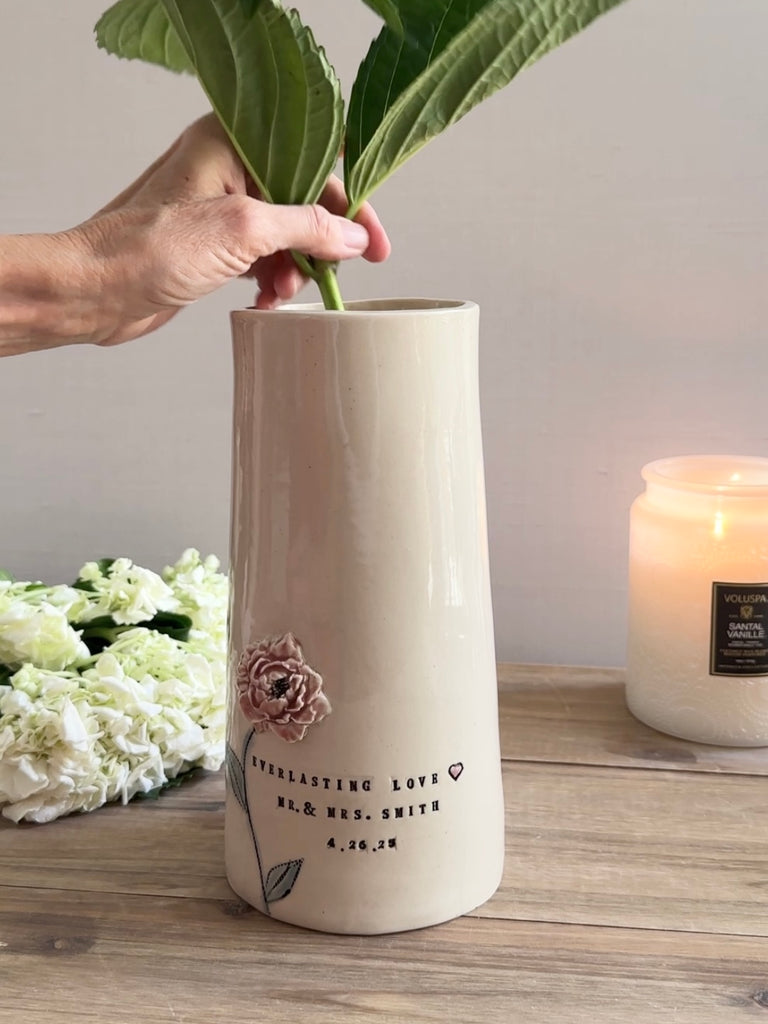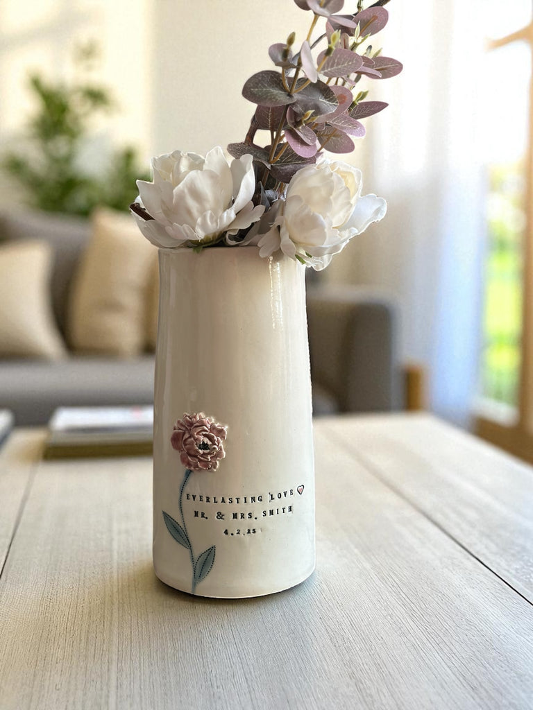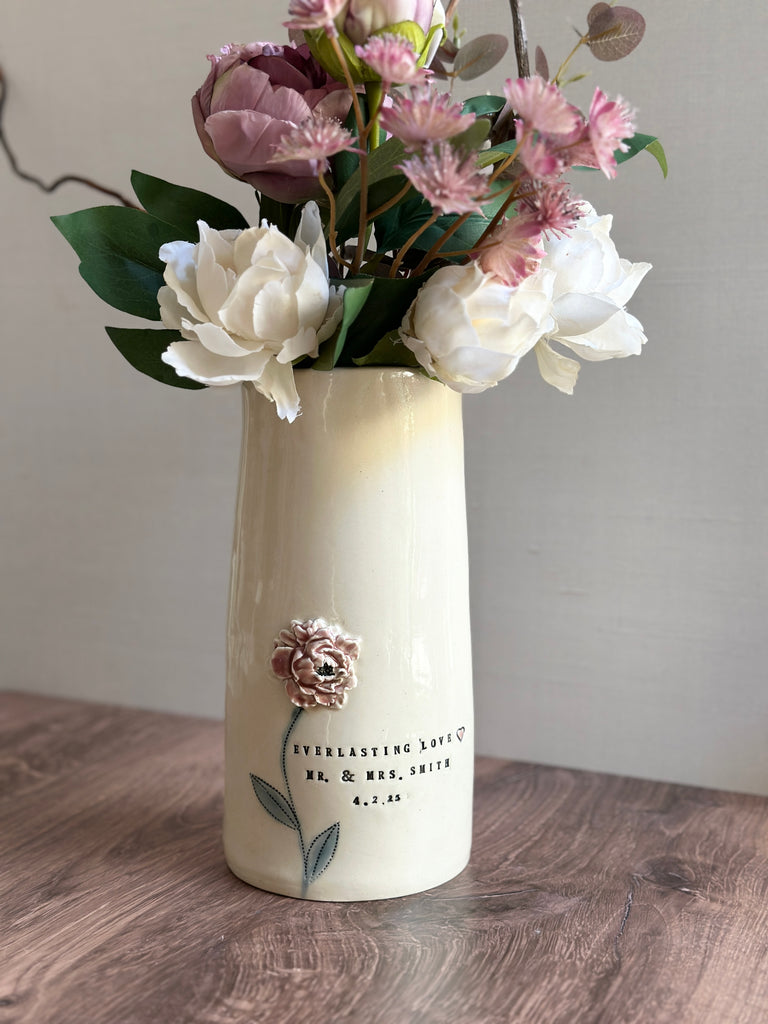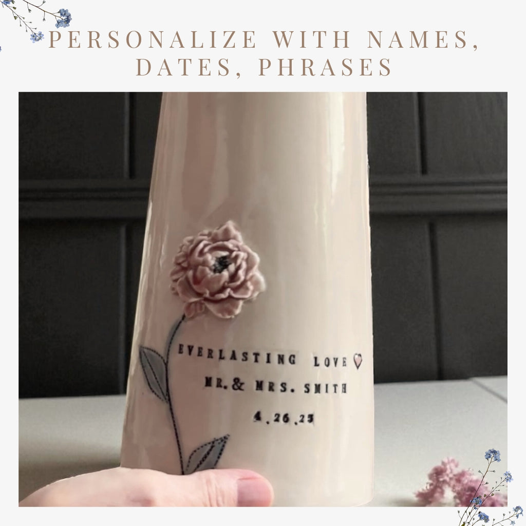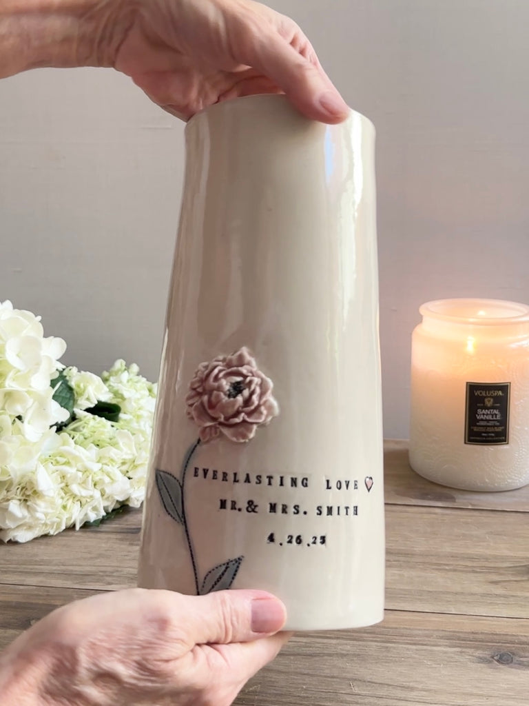 This handcrafted ceramic vase features a sculpted pink peony with a hand carved stem, finished in a soft cream glaze. Personalized stamping makes it a meaningful wedding, anniversary, or milestone gift — an heirloom to be treasured for years.