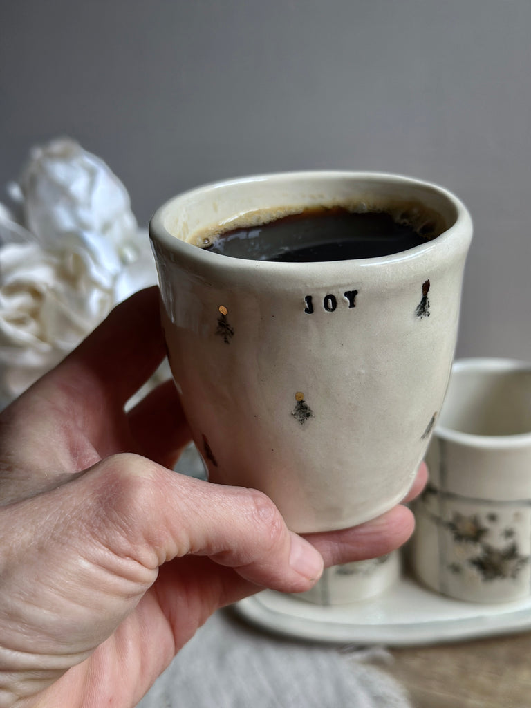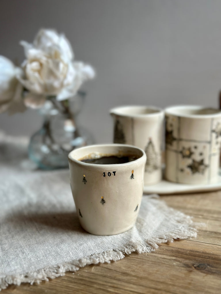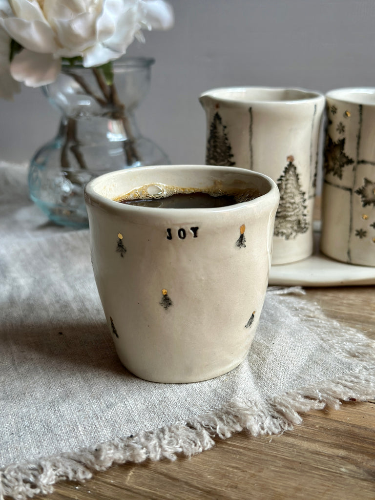 Adorned with hand-drawn Christmas trees and touches of 22kt gold, this piece sparkles in the light. "JOY" is handstamped and glazed into the cup.