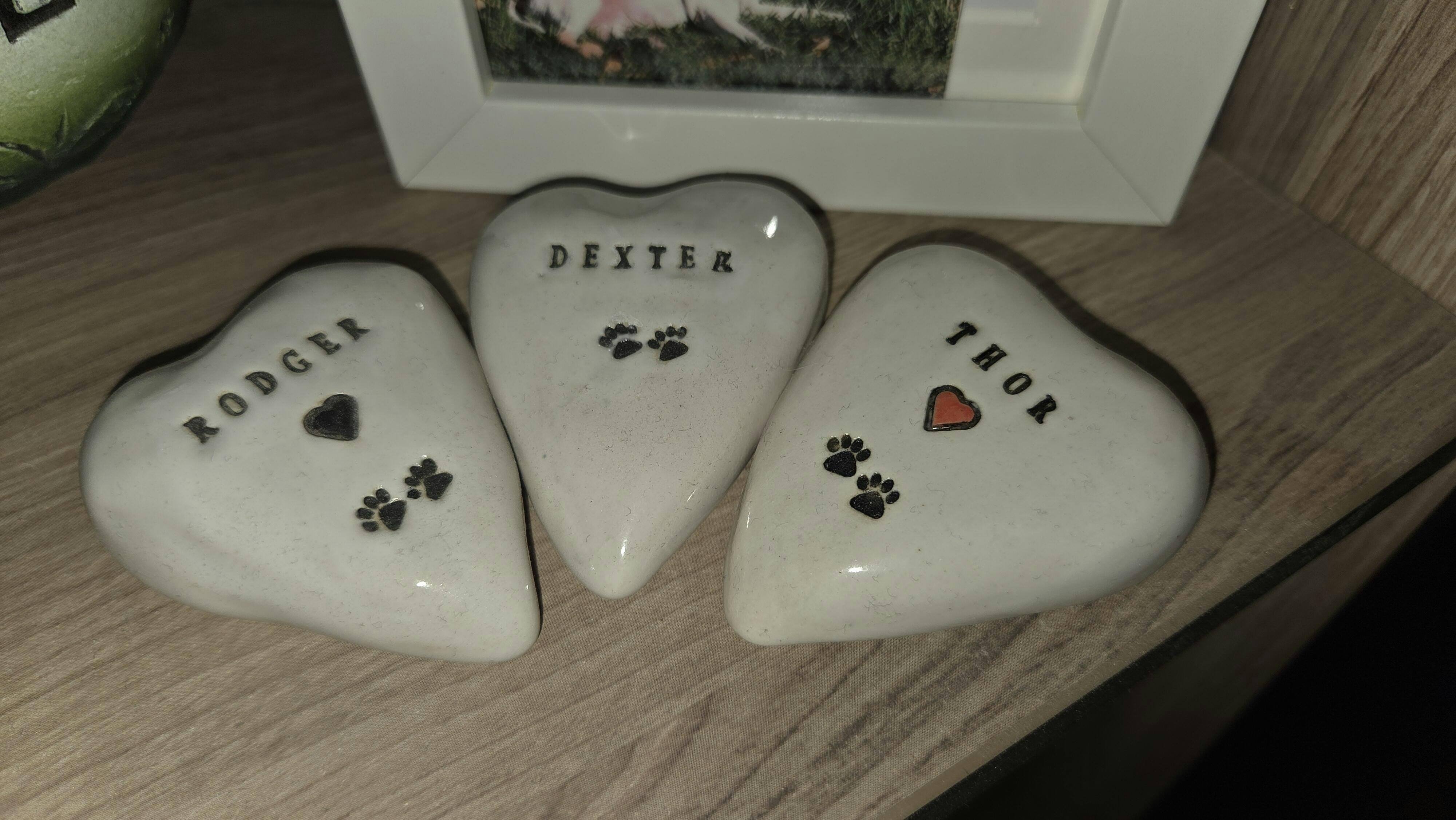 β₯ handcrafted from white stoneware clay, these solid hearts are glazed in a shiny white glaze with stamped and black glazed letters-- option to include pet name, date, Β paw prints and a sweet heart, in either red or black.Β