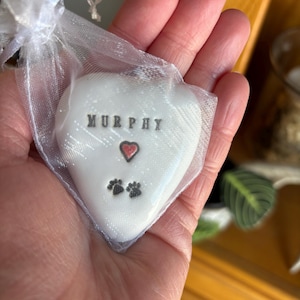 - In the PERSONALIZATION BOX, add: 1. Your Pet's name, 2. whether you would like a red or black heart added, 3. whether you would like paw prints added, 4. organza bag color preference-- black or white.