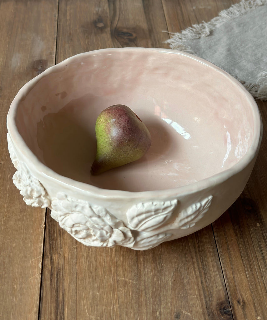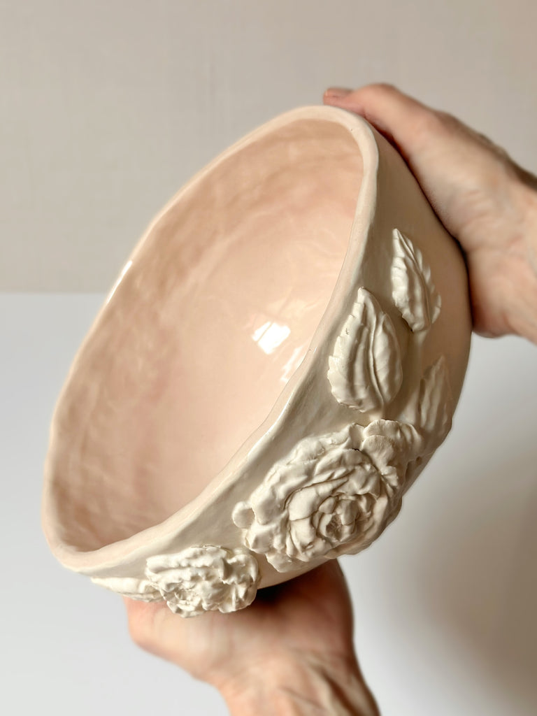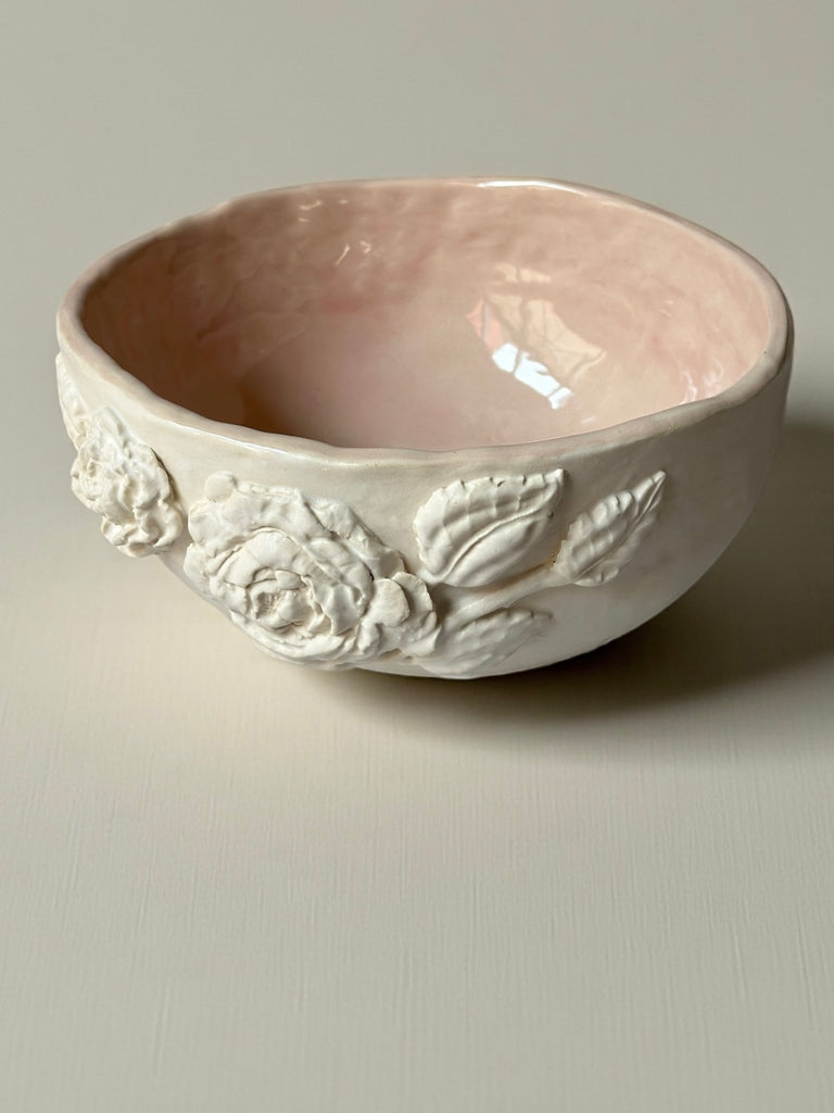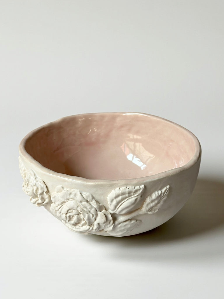 A hand-built stoneware bowl with a soft pink celadon interior and sculpted florals.