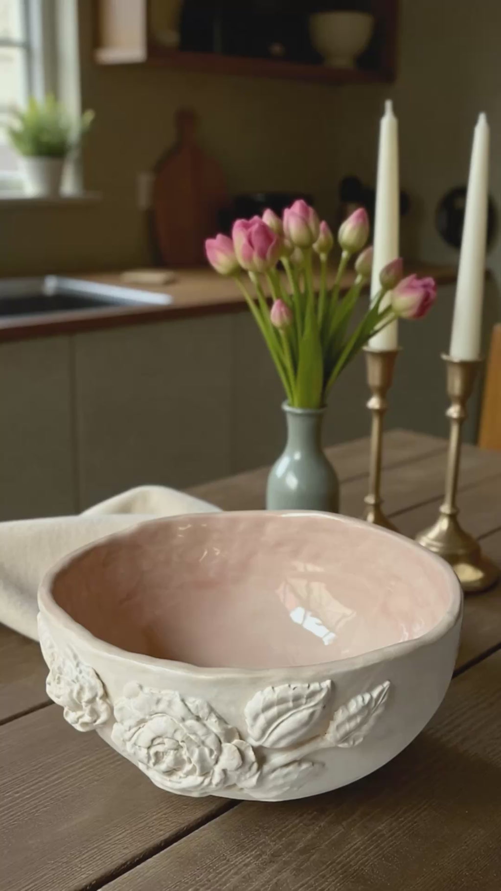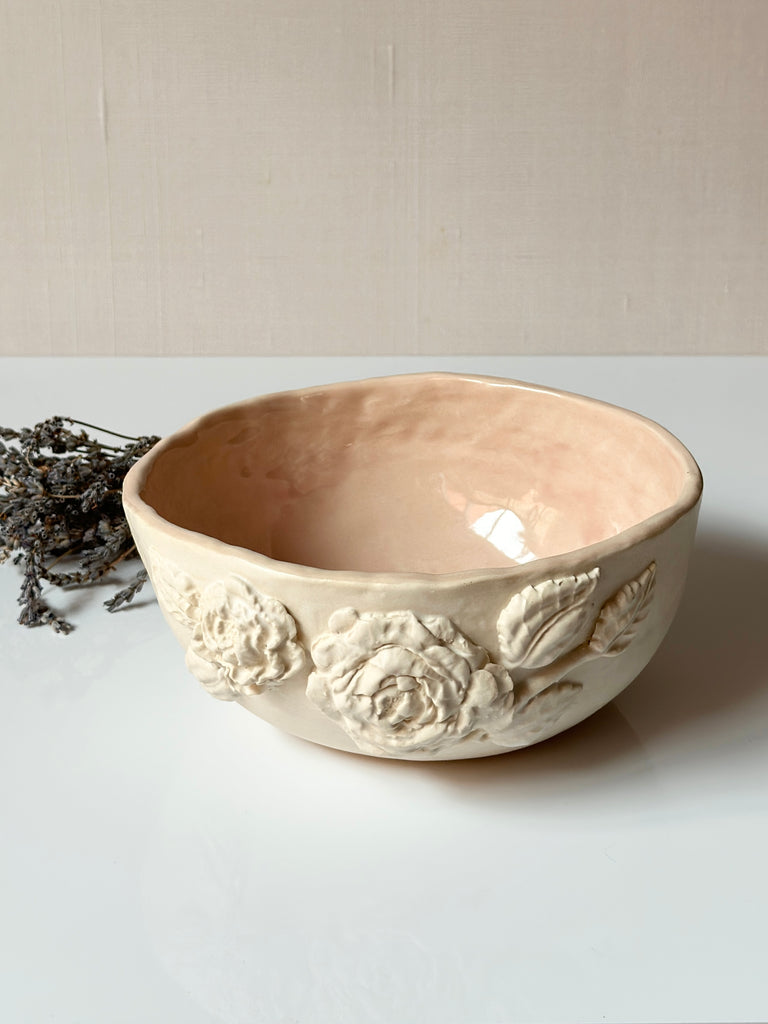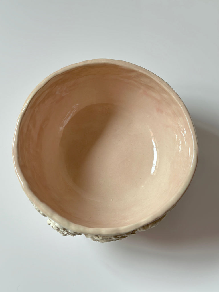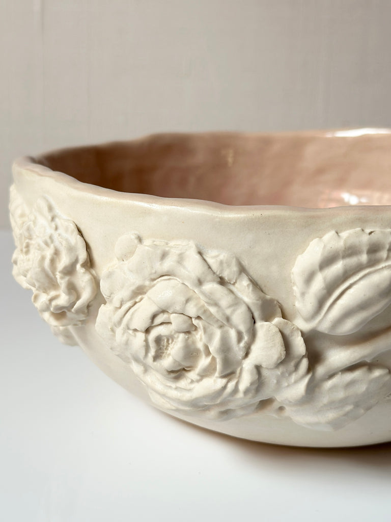 A hand-built stoneware bowl with a soft pink celadon interior and sculpted florals.